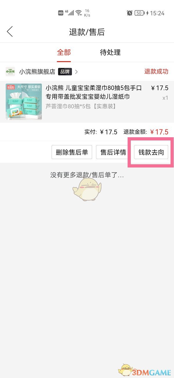 2、点击订单下方的【钱款去向】即可查看退款账户。