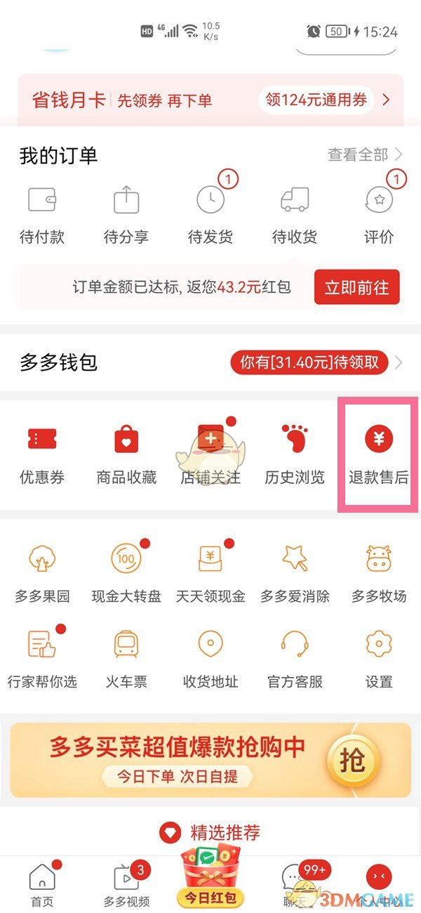 1、打开手机拼多多,在“个人中心”页面点击【退款售后】。