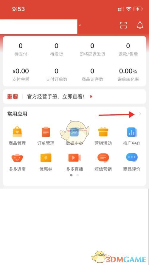 1、打开拼多多商家版APP,点击常用应用旁边的箭头进入应用中心。