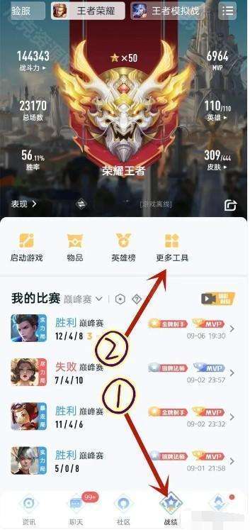 2、随后在下图所示的页面,挑选右下角【战绩】-【更多工具】功能;