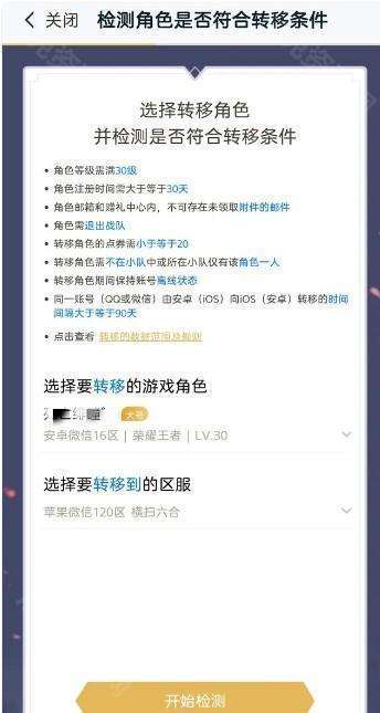 5、在下图的页面,选择要转移游戏的角色和转移的大区点击【开始检验】即可。