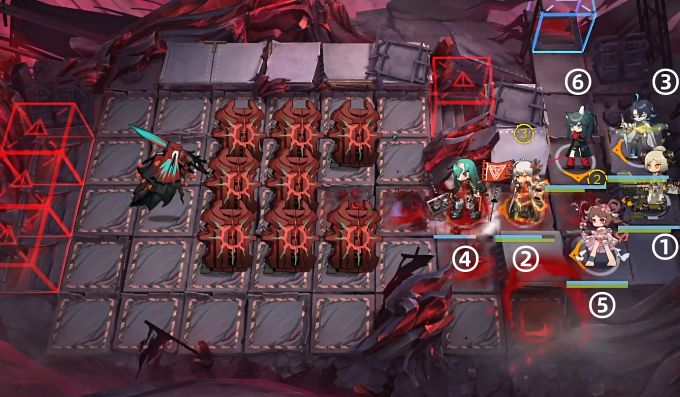 如图所示,开场依次部署伊芙利特(朝左)、塞雷娅(朝左)、流明(朝左)、星熊(朝左)、艾雅法拉(朝左)、德克萨斯(朝下)