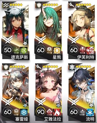 德克萨斯(精二50级)、塞雷娅(精二60级)、星熊(精二60级)、艾雅法拉(精二90级)、伊芙利特(精二60级)、流明(精二60级)
