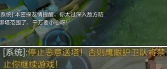 若弹出这条消息,你还一昧的送塔,那么你将会被踢出本对局,改为人机来接手这场对局。