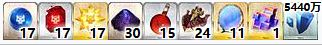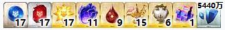 总计:杀之辉石*17、杀之魔石*17、杀之秘石*17、蛮神心脏*11、血之泪石*9、封魔之灯*15、奇奇神酒*6、传承结晶*1、量子*5440万