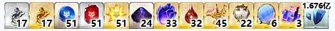 总计:杀阶银棋*17、杀阶金像*17、虚影之尘*24、血之泪石*5、奇奇神酒*4、九十九镜*6、量子*440万