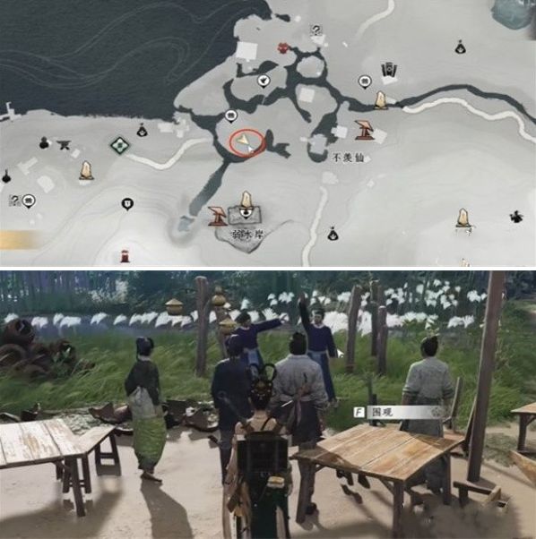 1、首先打开地图来到下图标记位置进行围观触发奇遇任务。