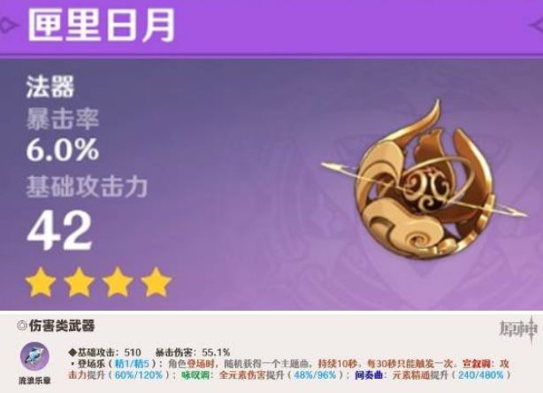 这是莫娜的输出武器,这个武器需要莫娜在场上站短期时间才能叠满元素加成,可以比较有效的提升莫娜的伤害输出,没有这个也可以选择匣里日月代替。