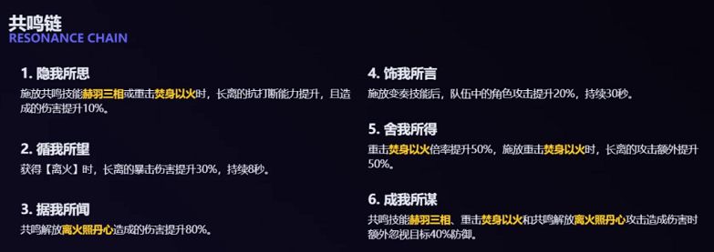 隐我所思:施放共鸣技能赫羽三相或重击焚身以火时,长离的抗打断能力提升,且造成的伤害提升10%。