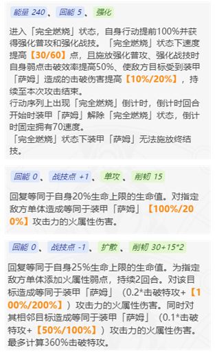 1、因为大招涉及到很多机制所有先看大招。240的能量需求可以说是整个游戏里面最高的了,这个技能是一种状态转换类的技能,可以赋予流萤一些额外机制。小编把强化状态的普攻和战技也放在一起看。变身后的战技是可以施加火弱点的,同时技能倍率和击破特攻相关。