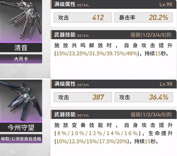 3、吟霖的备选武器可以选择大月卡武器清音,因为清音的副词条也是暴击率,特效同样给攻击力,堪称小专武。
