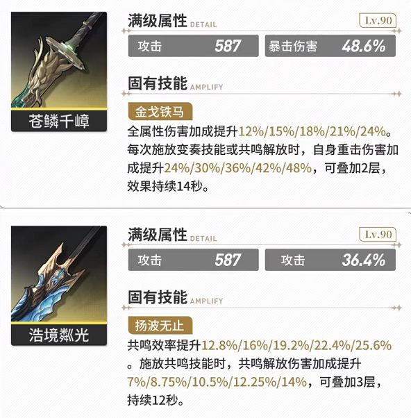 1、忌炎武器的首选肯定是忌炎的专武苍鳞千嶂。适配度极高,12%的属伤和48%的重击伤害加成,对于忌炎的总提升极大,强烈推荐。