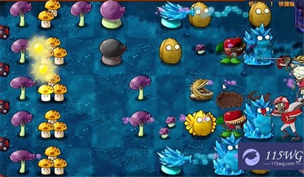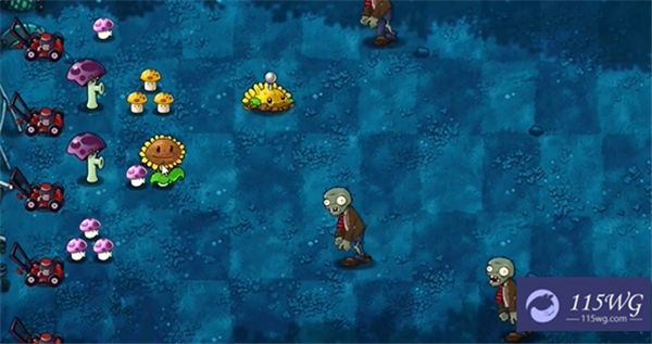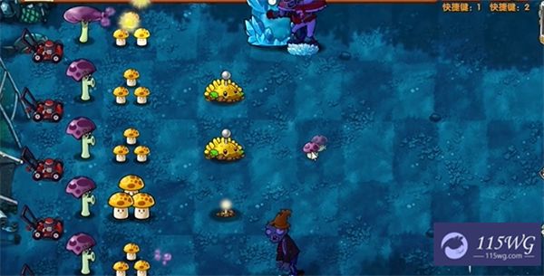开局后,首先在左侧种植两个胆小菇,这些胆小菇能够有效地减缓僵尸的推进。随后,合成两格阳光菇,以确保在接下来的回合中能快速获取阳光。