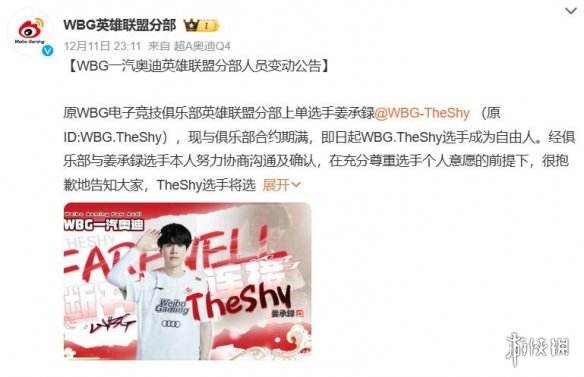 2、WBG战队于2023年12月11日发文称theshy选手与俱乐部合约到期,即日起成为自由人身份;