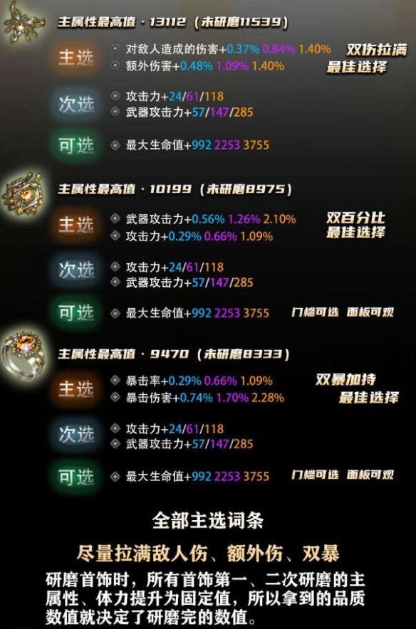 首饰研磨系统会随机出词条,那么输出的词条怎么选呢,所有的首饰主选词条都尽量选择拉满对敌人伤害、暴击、外伤,除此之外再次选攻击力,最大生命值最后选,以下就是详细介绍。