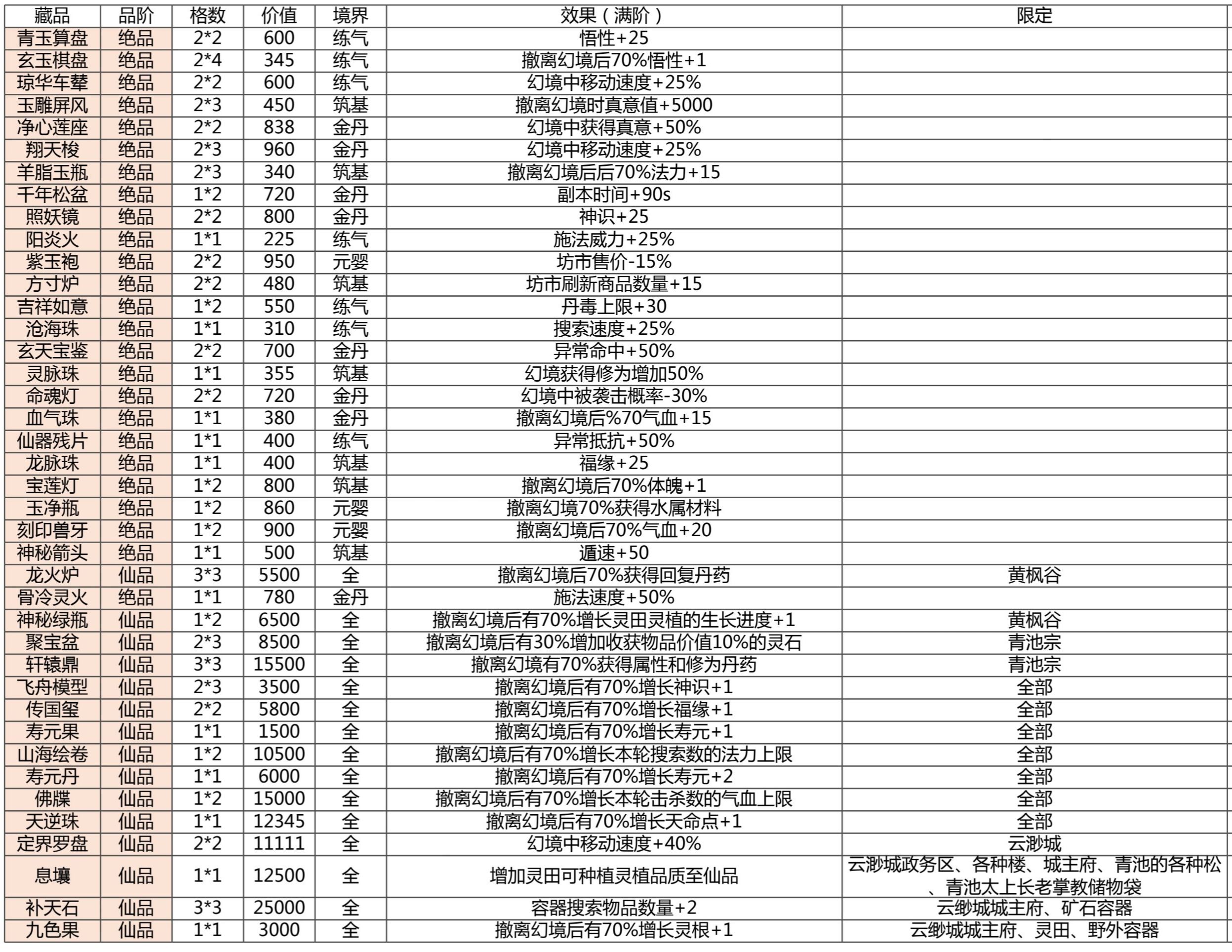 在《幻境修仙》中,青玉算盘、玄玉棋盘可在黄枫谷获取;琼华车辈、玉雕屏风出自青池宗;净心莲座、翔天梭、羊脂玉瓶等为全地图通用藏品;吉祥如意、沧海珠集中于云渺城区域;灵脉珠、命魂灯需探索青池宗高层储物袋;龙脉珠、仙器残片则分布于云渺城城主府及矿石容器中。