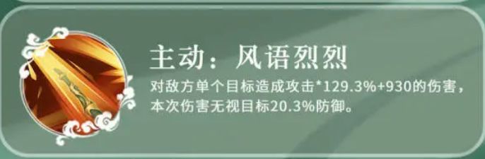 他还有另外的一个主动技能叫做风雨烈烈,这个技能是需要大家手动使用的,目标是敌方的一个单体目标,造成的攻击数值达到了129%的数值,此时的固定伤害是930点的伤害,而且这一次的伤害可以直接无视掉敌人身上20%的防御,在他的被动,也就是春雷震技能上面,可以带来一个忽视反震的效果,此时他提升的自身忽视反正数据达到了21%,并且还可以在攻击敌人的时候带来无视11%防御的效果,如果大家使用星列满目的时候触发这个被动的话,还可以对被驱散增益的敌人带来伤害提升的效果,这里提升的数值达到了42%,如果是用到被驱散的增益敌人身上,此时的伤害数值不高于他自身的数值,那么此时还会触发一个集思广益的被动,所以徐庶各个技能之间的连系触发效果,是可以达到一个回合里面多次触发的。