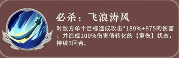 所以在需要攻击的时候周泰是可以针对敌方输出进行主要攻击的,他在技能上面有一个必杀技,叫做飞浪涛风,使用这个技能的时候,是针对敌方的一个目标进行攻击,这里的攻击百分比达到了180%,然后加上975点的固定伤害,此时还会有百分之百的伤害可以进行转化,转化的能力就是一个重伤的状态施加给敌人,在敌人身上重伤的状态会影响后面三个回合的掉血效果,那么他在被动能力上面还有一个赤胆丹心,这个技能就是周泰在被敌方击杀并导致死亡的时候,有百分百的概率会重生。