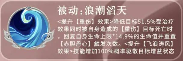 流血状态跟上面的一个重伤状态其实是类似的效果,都是可以持续让敌人进行掉血的,所以他的各个增益之间都是可以联合使用的,他的最后一个被动叫做浪潮滔天,使用的时候会跟他带来的重生状态有关,如果是施加重伤状态给敌人的话,那么这个被动触发就会提升重伤的效果,此时会降低目标51%点的受治疗效果,同时他自身造成的重伤,如果给敌人造成死亡的情况下,他还可以给周泰自身带来生命恢复的效果,这里会根据他生命数值的14%点上限数值带来生命值恢复,并且会重置赤胆丹心的触发次数,那么后期再提升了这个技能的情况下,他自然还会得到更高的触发概率,这个效果还是非常有用的,特别是在敌方控制比较多的情况下,他用这个技能可以让敌方的一些增益效果全部不生效。