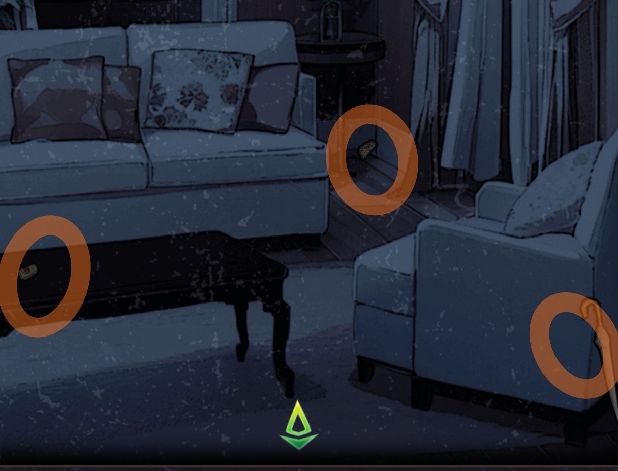 杨婉芝房间:拿起沙发旁边的雨伞,拿取地上的木碎片1和桌子上的木碎片2。