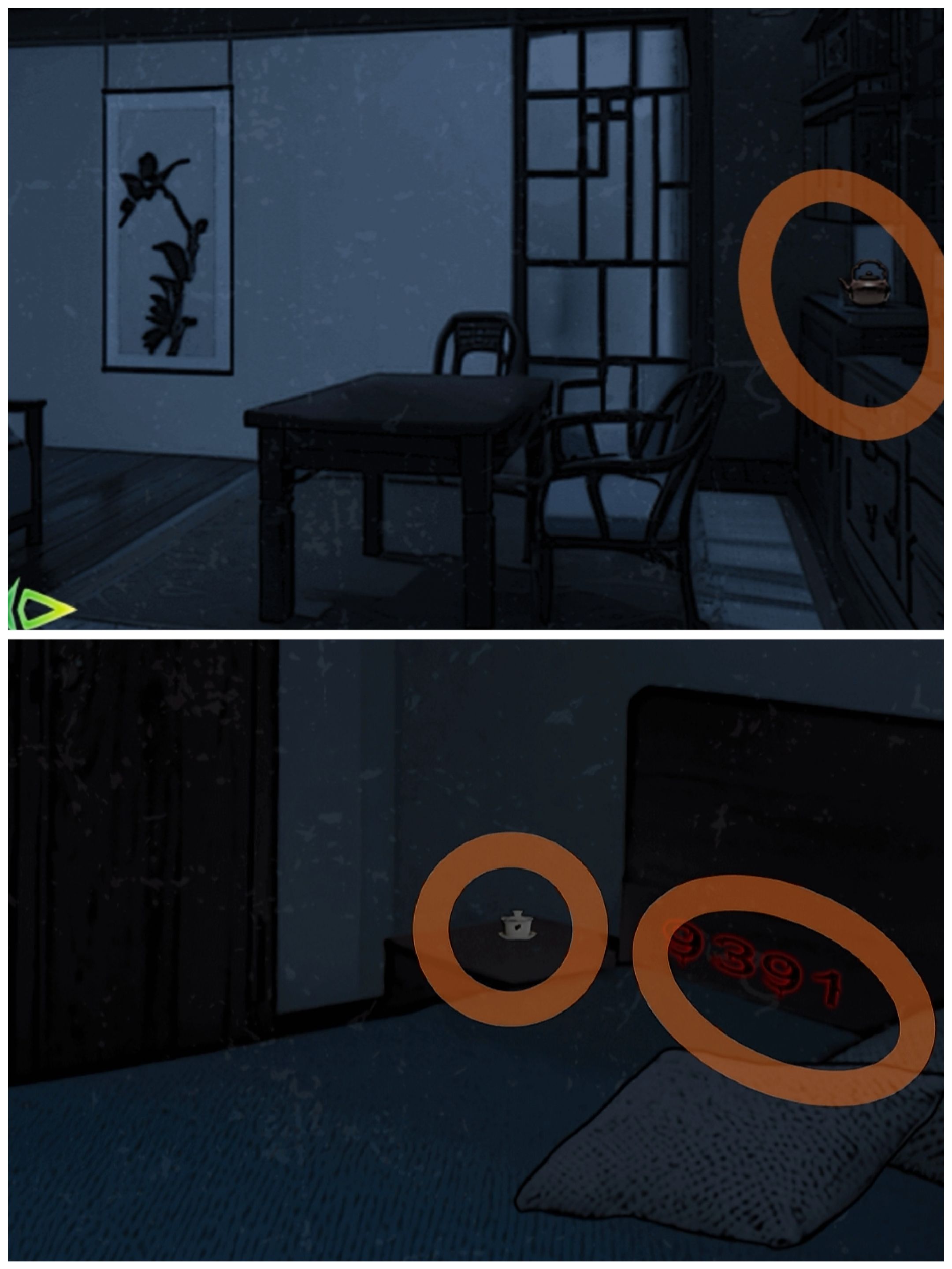 西院:杨婉兰房间:拿起柜子上的茶壶,左走拿取床头柜上的茶杯,点击枕头露出后面的密码9391
