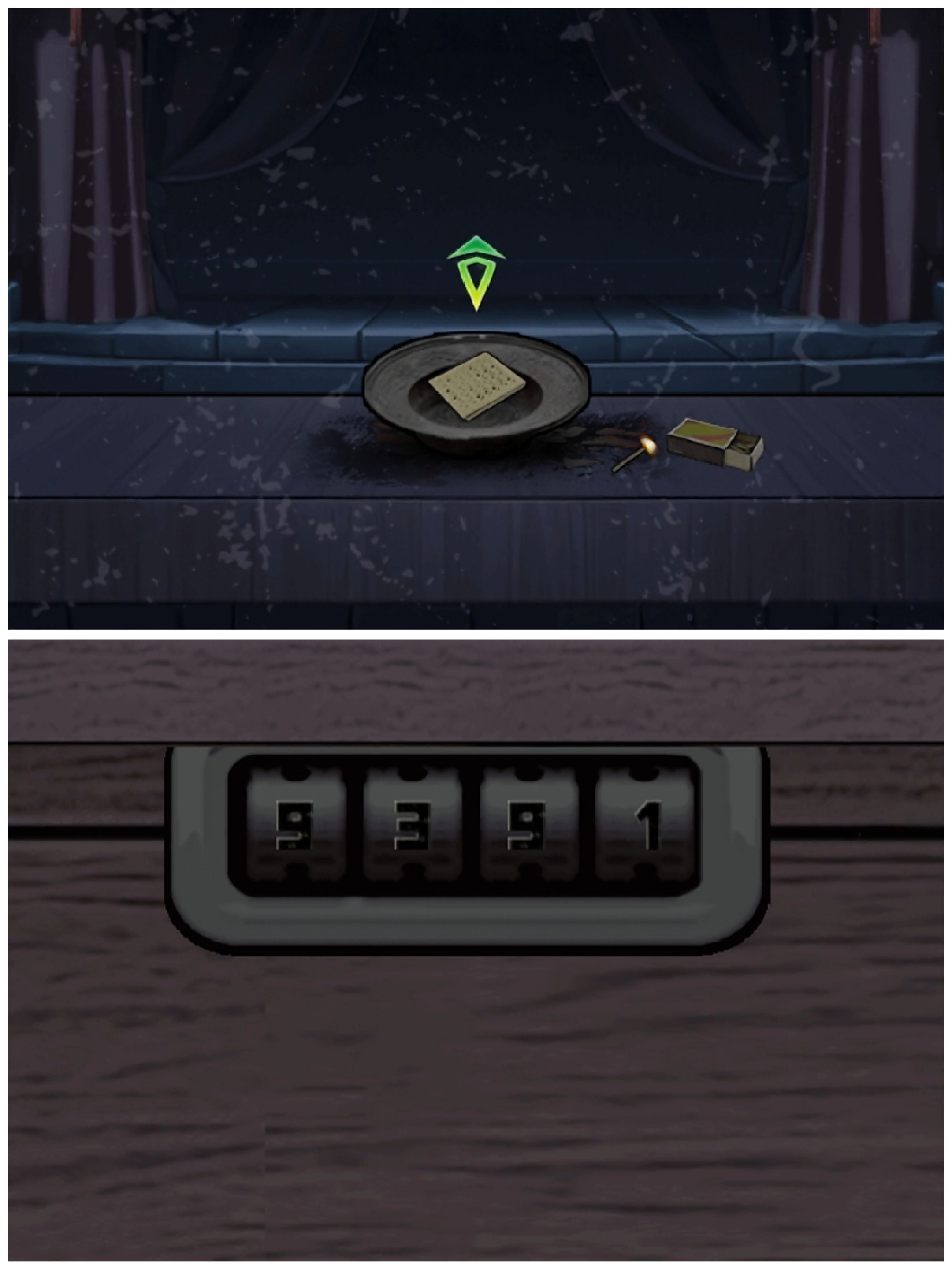 向右将烧火盆放到燃烧的灰烬上,将冥币放里面用火柴点燃,出现鬼魂说在后台,来到后台点击椅子上的盒子根据西院枕头后面的数字密码9391,拿到女鬼的头。