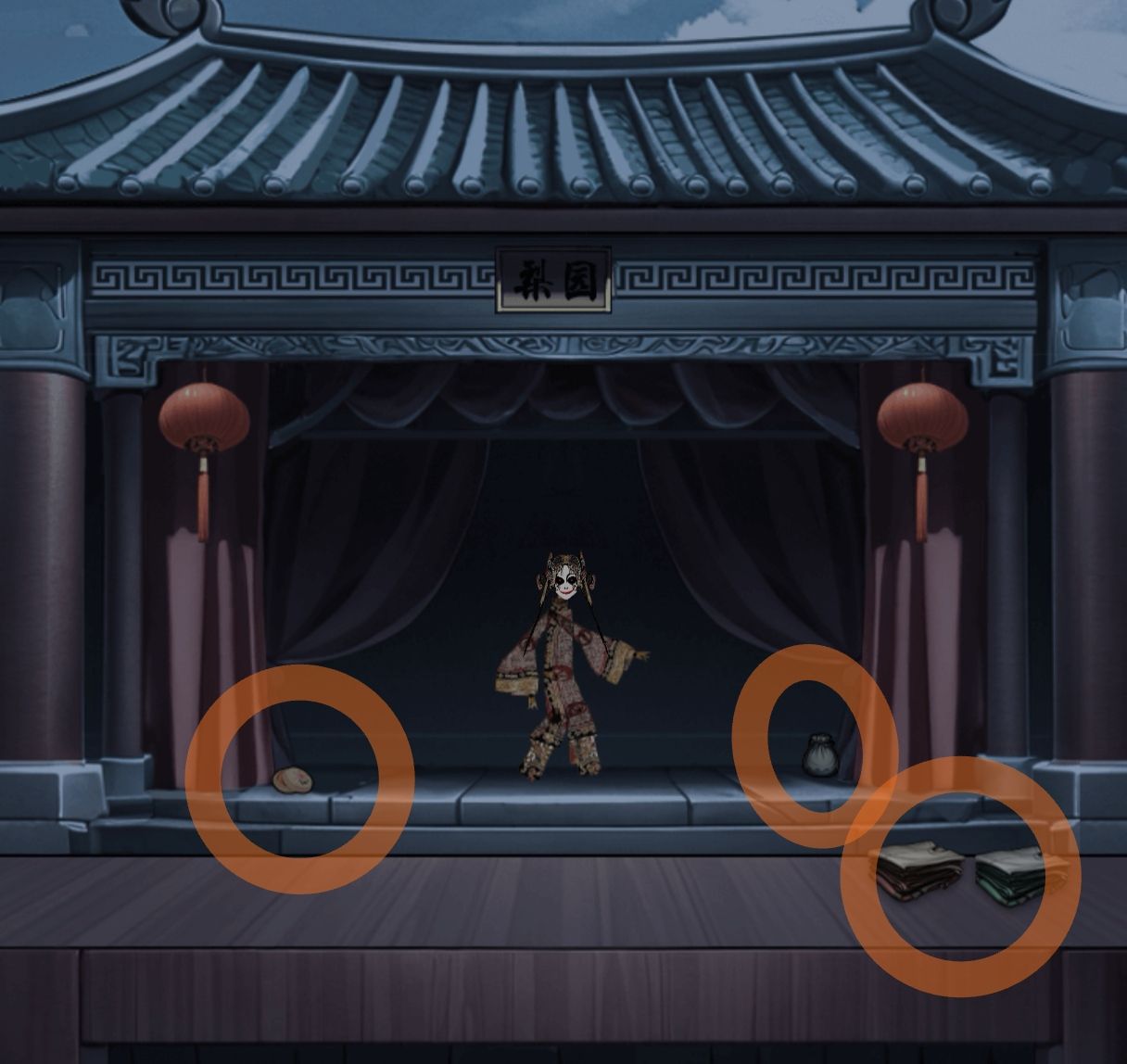 走右面(前面有小高能突脸注意!!!),拿取戏台左右的物品,茶包和胭脂,台子上还有红绿两种颜色的戏服(这里的戏服拿取与文思堂鬼脸的颜色有关,但小编试了好几次应该是纯随机的,直接随缘选择穿吧)