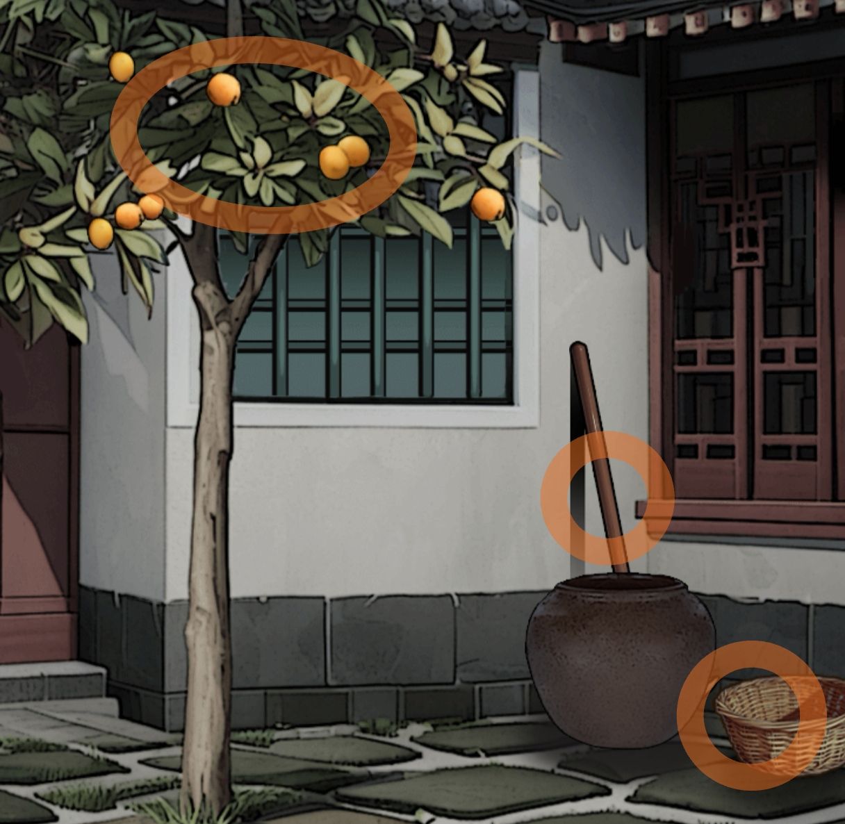 别雅园:进入,先走左面,拿起地上的钩耙、烂枇杷和左下角的砝码,用钩耙够取树上的枇杷,获取枇杷。
