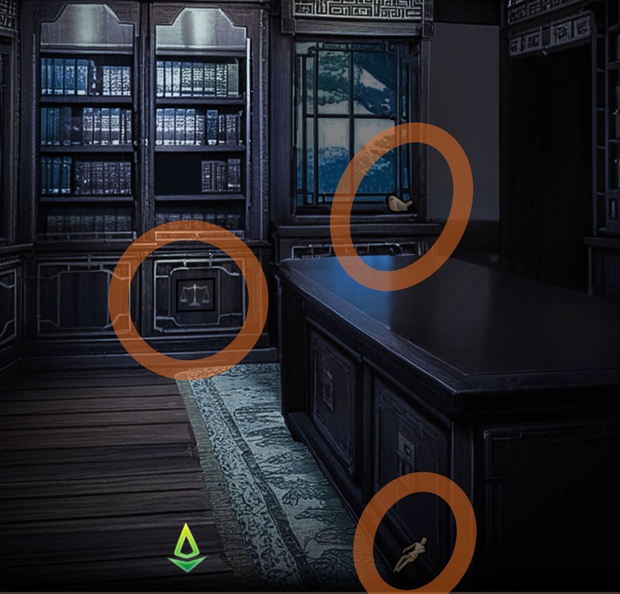 捡起地上的木偶,获取窗台上的木鸟,点击书柜下的天平图案,将砝码放上去。