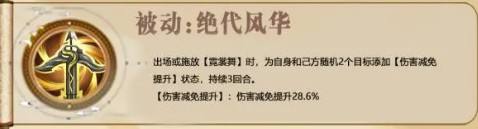 出场或施放【霓裳舞]时,为自身和己方随机2个目标添加【伤害减免提升】状态,持续3回合。【伤害减免提升】:伤害减免提升28.6%