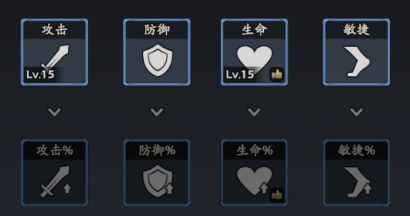 研究:攻击、攻击百分比、生命、生命百分比、敏捷、敏捷百分比、暴击概率、暴击效果、命中、忽视反伤。