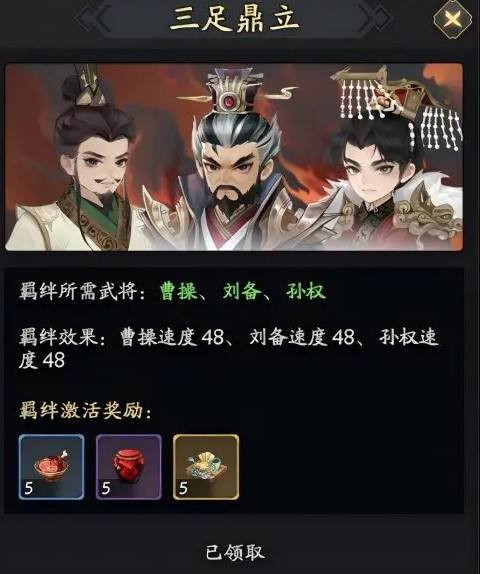 主公同时拥有曹操、刘备和孙权,就可以解锁专属羁绊【三足鼎立】,羁绊效果加成:曹操速度48、刘备速度48、孙权速度48,别忘记领取羁绊奖励哦!