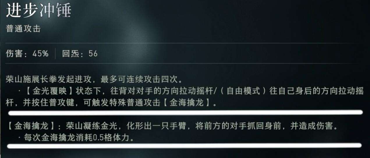 荣山的普攻进步冲锤是一个四段连招,前三段是向前的一个直拳,最后一个是肩撞能打出击退,整套打完会有僵直,但是他的前三段是能随时取消后摇的,打小怪时不用打完四段,省出时间调整身位。而关键的就是金光覆映buff,释放任意技能后都会触发,持续大概几秒左右状态期间角色身上会有金色流光特效。这时候背对对手,同时拉动摇杆向后,再按住普攻键,就能触发金海擒龙的效果,这个投机能把敌人抓过来,类似机器人的q,还能打出短暂僵直,体力消耗0.5格。所以体力低的时候就需要大家谨慎一点。