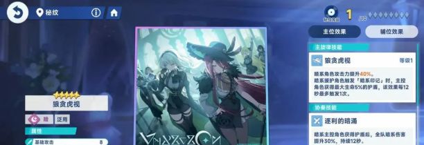 秘纹系统这就是组队战斗的核心,每一个队伍全部都需要靠秘纹组合去有效提升战斗力。会分成两种不同的种类,一种是主要位置,另外一种就是辅助位置,把这两者搭配在一起,才可以更好的发挥效果。主位秘纹的关键就在于解锁一些专属的技能会分成协奏技能,还有主旋律技能。比如狼贪虎视,这就是可以直接生效的一个,可以迅速的提升暗系角色40%的攻击力。不管是主要的控制角色还是援护角色,只要是暗系角色都可以获得这一个加成提升输出。