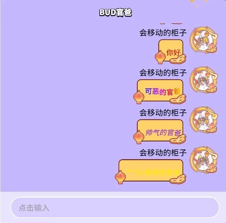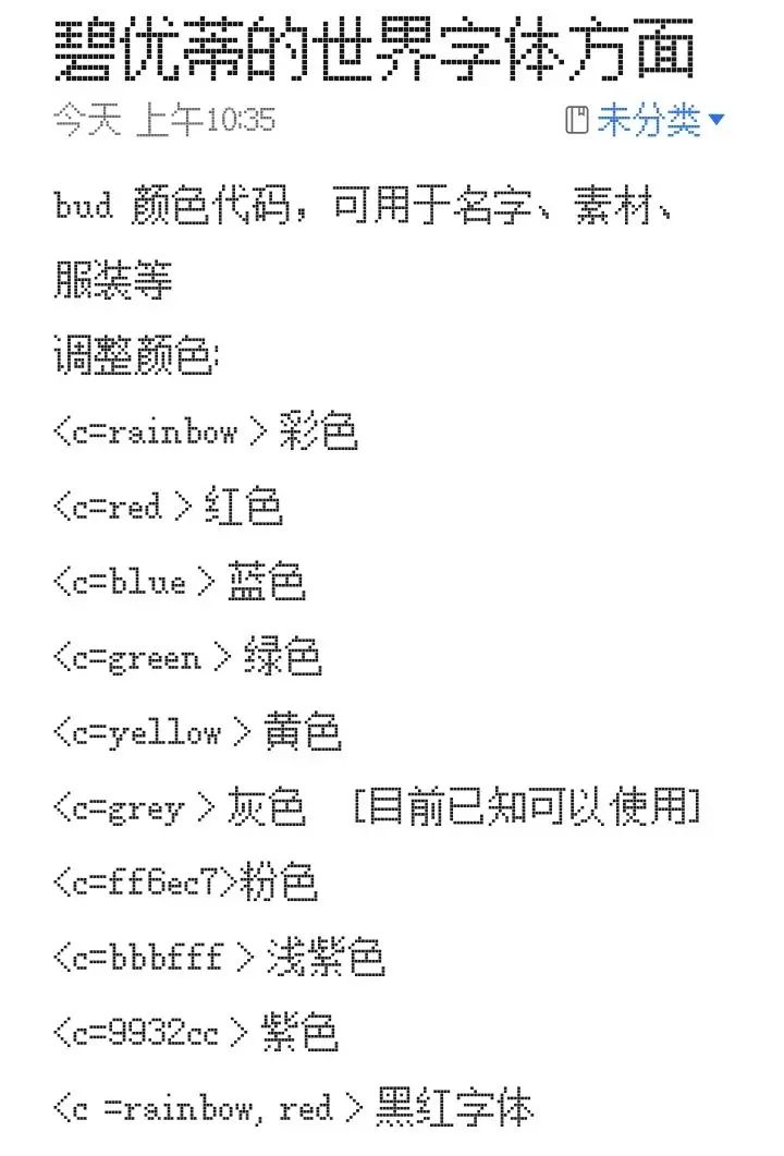bud 颜色代码,可用于名字、素材、服装等 图1和图2:图1是由关于改字体颜色的代码,图2是有关于改字体大小动效的效果的代码 图3是主页简介效果图 图4是实际运用:所给的代码在前面内容在代码后面例如 你好 图5是最后的聊天效果(效果展示图)