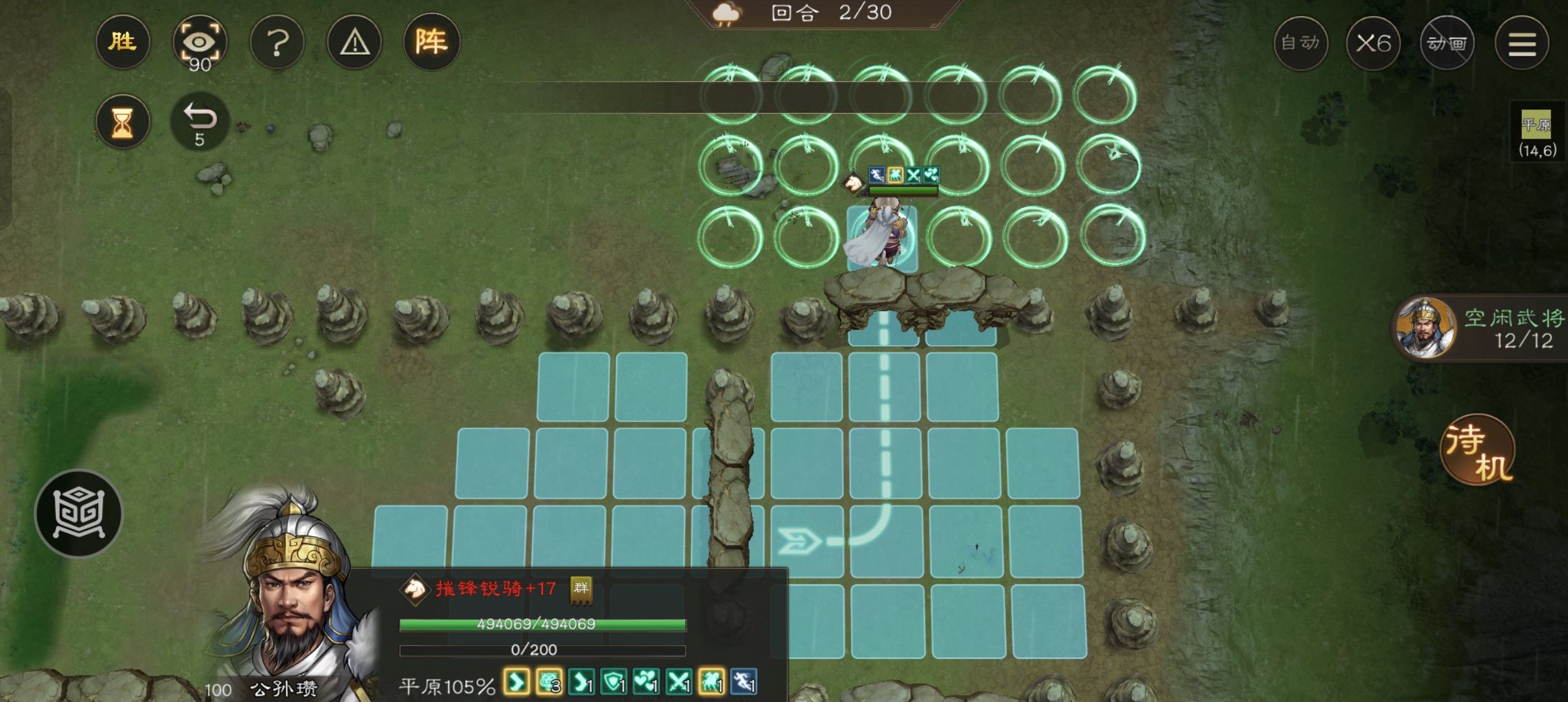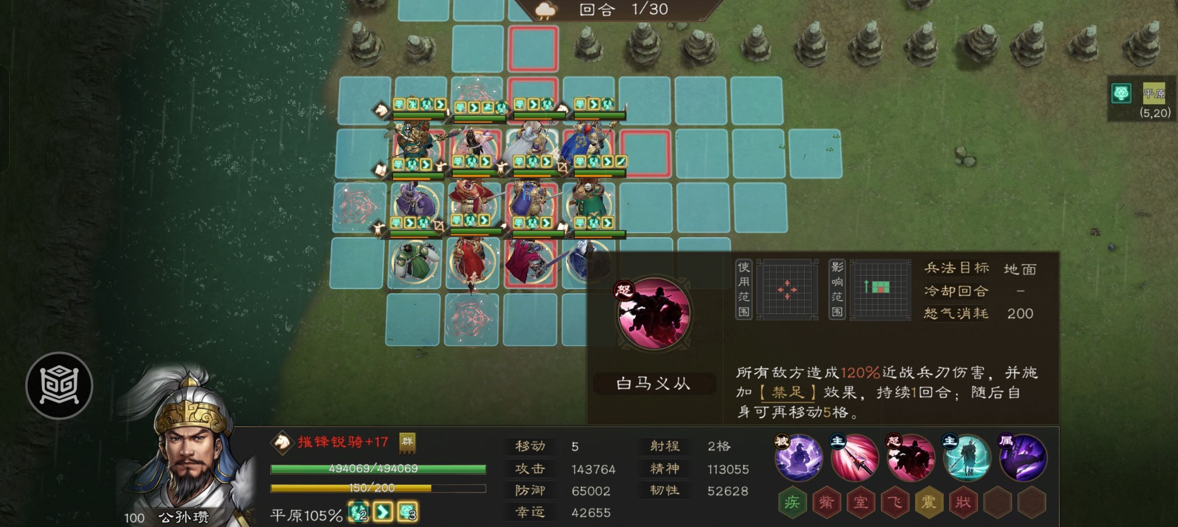 我们的核心是利用公孙瓒大招后的再动五格,前提是你有公孙瓒专属神兵以及22阶兵书加成大招技能