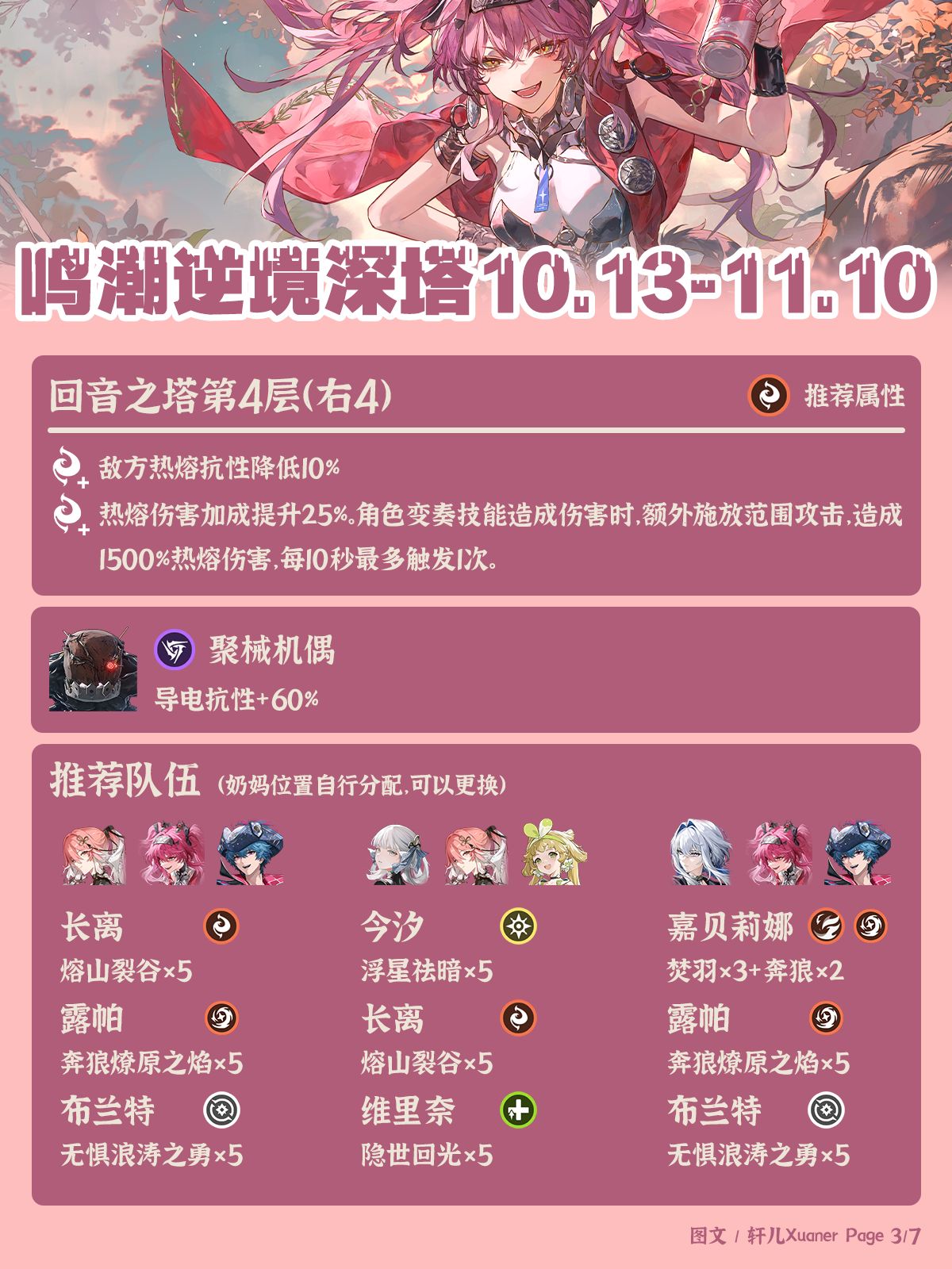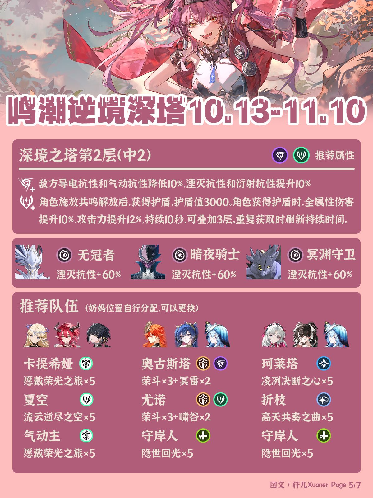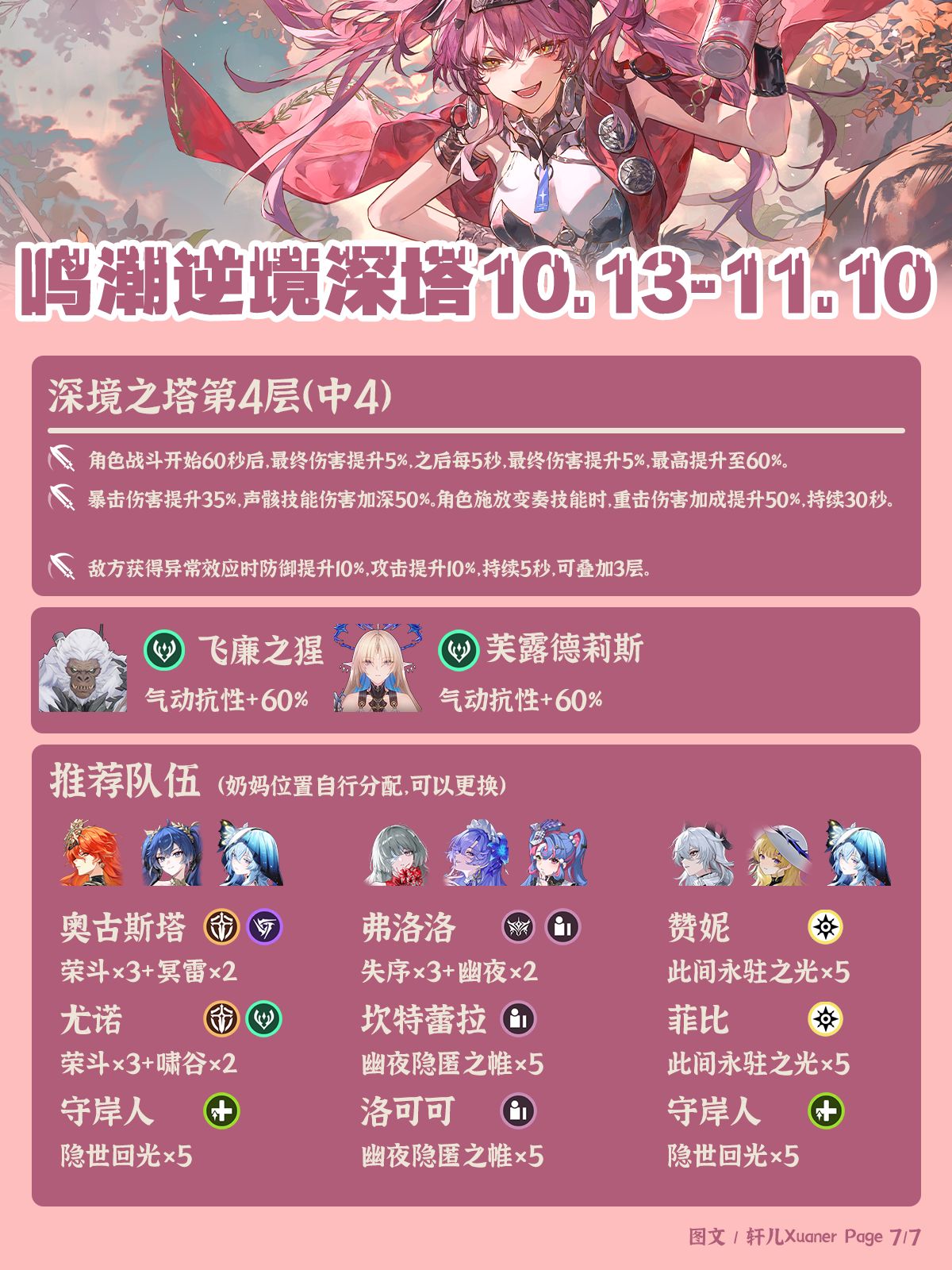 鸣潮最新深塔推荐阵容一览,玩家“轩儿Xuaner”的鸣潮最新深塔推荐阵容出炉,日月、卡提、弗坎仍是主力,赞菲可出场,嘉贝莉娜需等仇远。有需要的玩家可自行查看参考。