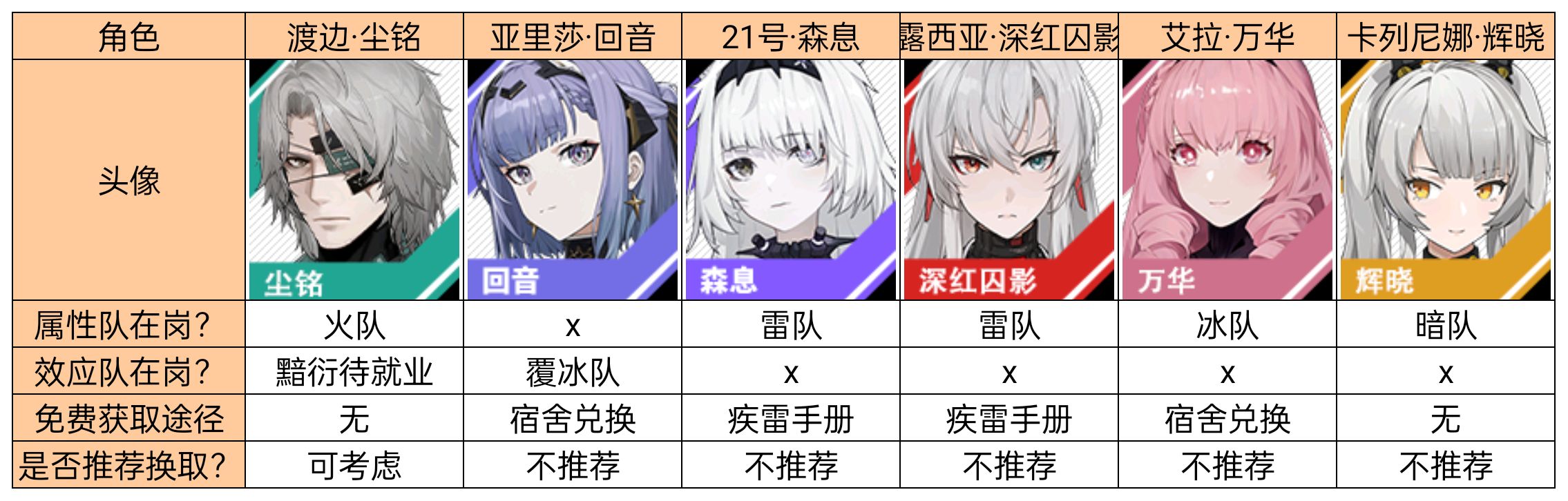 6个角色中,仅渡边·尘铭和卡列尼娜·辉晓无法免费获取,而辉晓已是目前在岗最久的角色,很可能在三个S版本内下岗,所以本次自选包仅推荐换取尘铭。