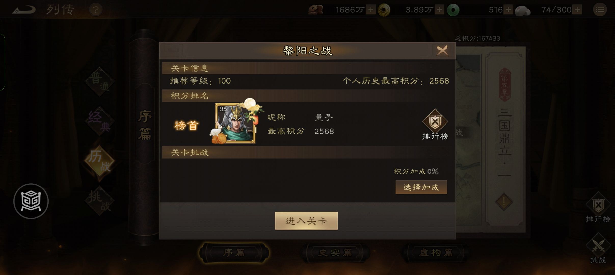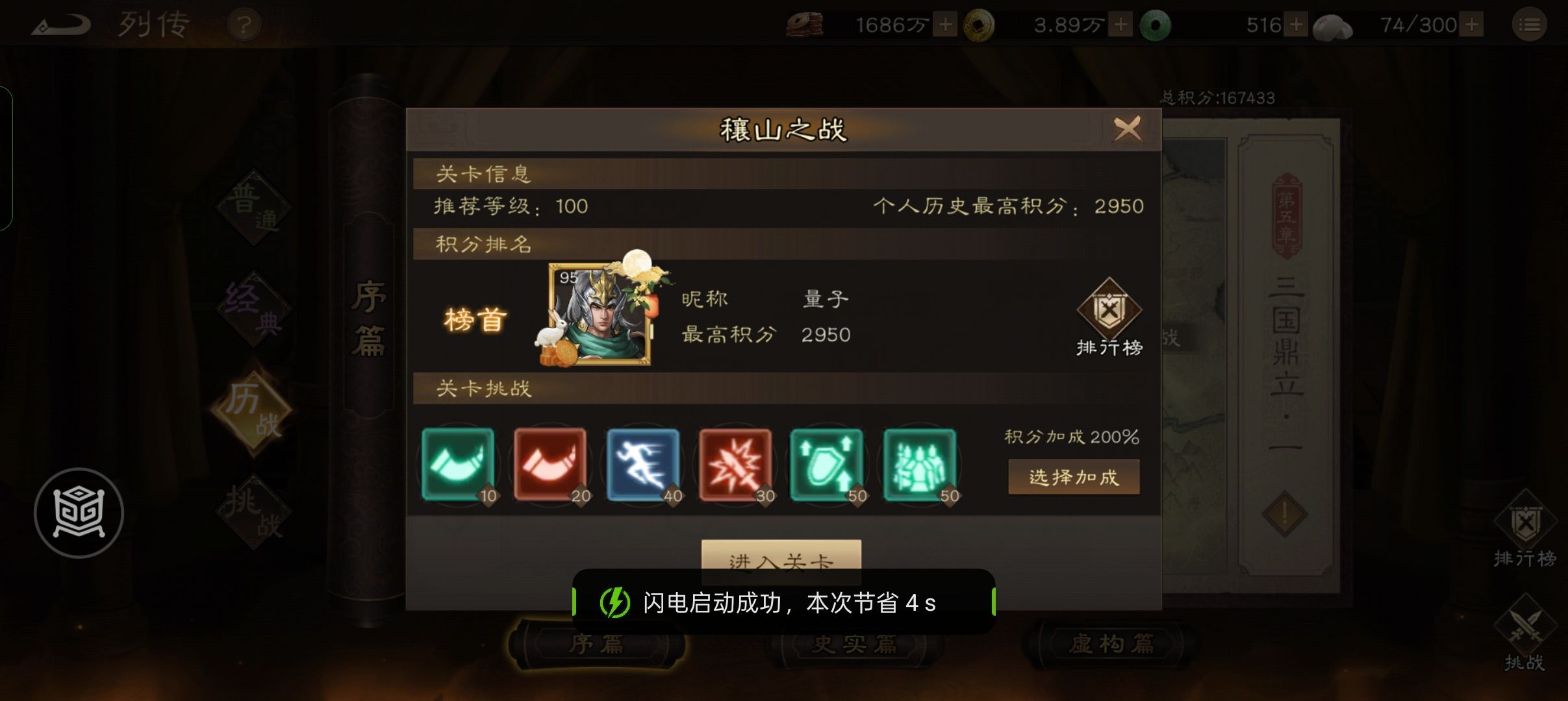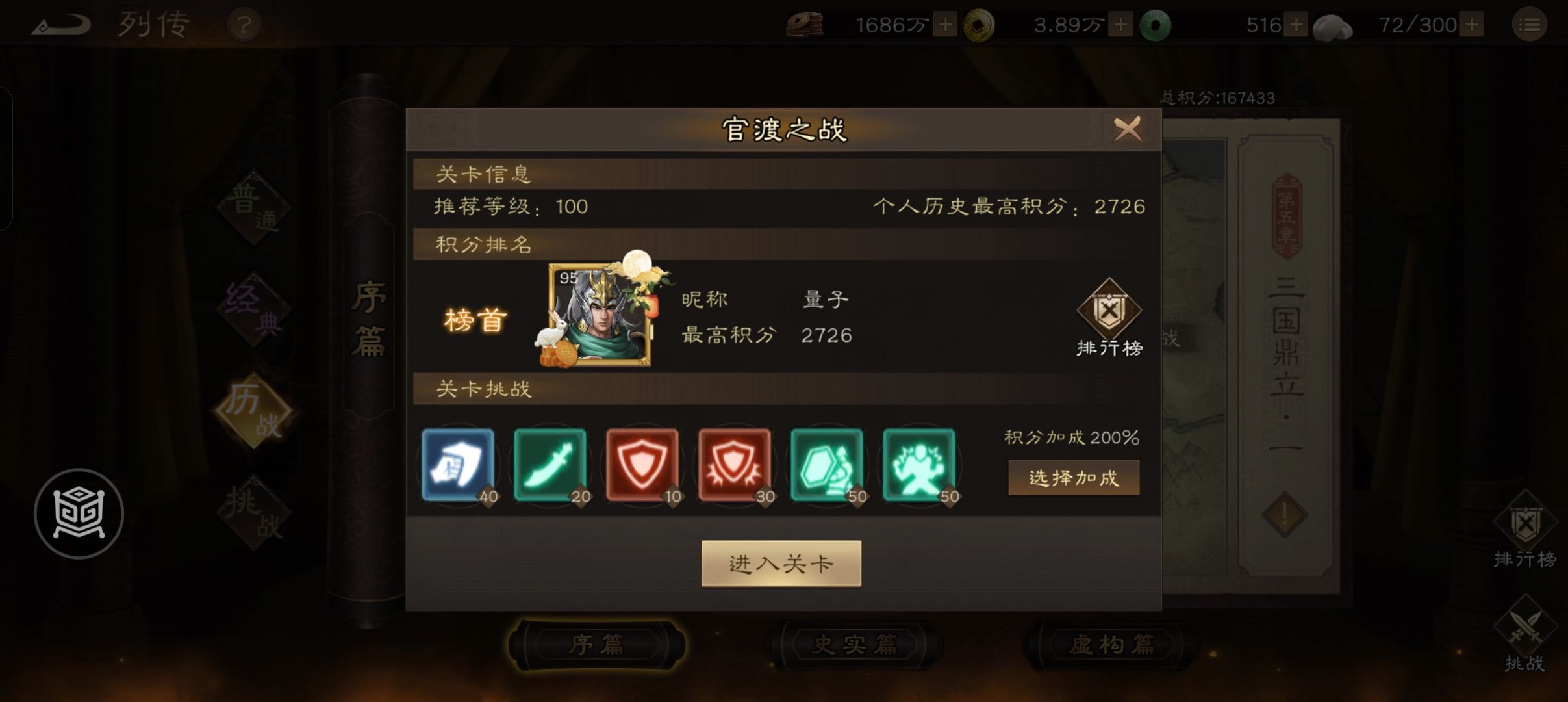 本关又是很难拿高分的一关,我的思路是左路上诸葛郭嘉李儒庞统等aoe法师,右路上关羽吕布吕玲绮等人。开局诸葛吹风破磐石,buff留到第二回合再加,法师用大范围法术打。右路吕布三人加速去打乌巢和三个贼兵,大概第四回合可以全灭