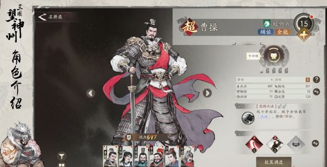 在众多的角色中,曹操还是比较有优势性的。技能组全部都是增伤效果,还有属性增益效果是一个比较强的辅助角色。而且有一些关卡还会强制的要他,所以一定要把曹操当成主力去培养。在资源比较少的时候,就可以把曹操当成副c来使用,技能方面建议选择短歌行,还有魏武挥鞭。魏武挥鞭这一个技能是比较实用的,就可以直接带到毕业,记得别忘记还需要升升级。在30级到60级之后,曹操就彻底的转型变成了辅助,这个时候毕业技能组也就定下来了,里面会有魏武挥鞭,还有天下归心。