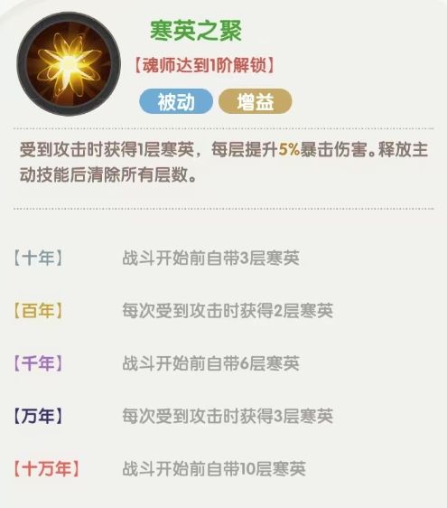 第1个被动是当月关受到攻击时,会获得一层寒英状态,每层提升5%的暴击伤害,释放主动技能后会将所有的层数清除。在提升魂环的年限后,战斗开始时最多直接自带10层寒英,每次受到攻击时都会获得3层寒英。