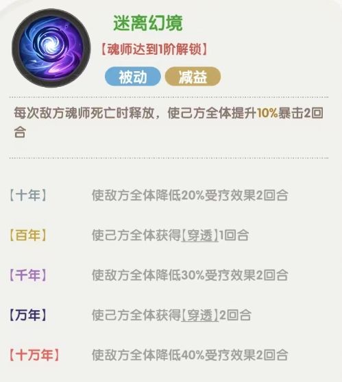 第1个被动效果是在敌方魂师死亡时释放,己方全体提升暴击,持续两回合,还能额外附加降低治疗效果,使己方全体获得穿透。穿透效果是当攻击存在护盾的目标时,可额外造成伤害,并且不会被护盾所抵挡,这样对于限制对方的治疗魂师和前排肉盾都有着很强的针对性。第2个被动是在自身被附加任意减益状态时,可以将效果直接转移回对方,另外在触发后还有几率立即释放一次主动技能并额外附加流血。这样胡列娜就不惧对方的控制效果,这在竞技过程中是非常有优势的。