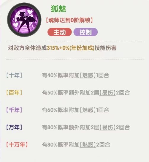 胡列娜的主动技能狐媚,可对敌方全体造成技能伤害,同时有几率附加魅惑和易伤这两个效果。达到10万年魂环时,魅惑的附加概率为80%,易伤的附加概率也是80%,都可以持续两回合。对方被魅惑后无法行动,在此期间受到的伤害无视防御,受到两次伤害后解除状态,易伤效果是使携带者受到的攻击伤害增加,这两个都可以加重对方受到的伤害,所以对强化己方的输出非常有帮助。