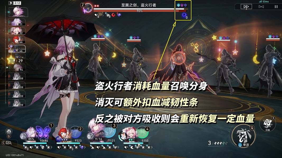此外阶段二盗火行者蓄力大招“莫因舍弃而哭泣”时,会不断刷新场上分身,可考虑消灭分身降低后续伤害,或者直接弱点击破打断蓄力。