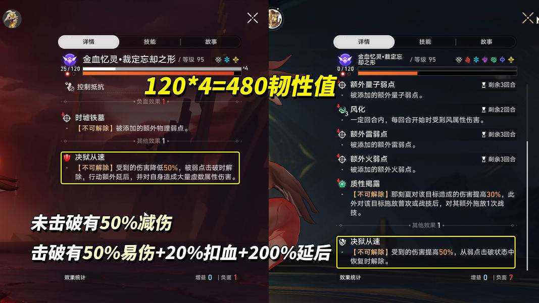 第2波:金血忆灵·裁定忘却之形,很多玩家应该都不熟机制吧?由于BOSS存在近乎秒人的技能,建议仔细看喔~ 裁定忘却之形未击破前有50%减伤,击破后50%易伤 扣血20% 行动延后200%。480长度韧性条,非击破队怎么打呢?走机制!战斗中用护盾抵挡它技能,或消灭召唤物都可让BOSS削减60点韧性条。