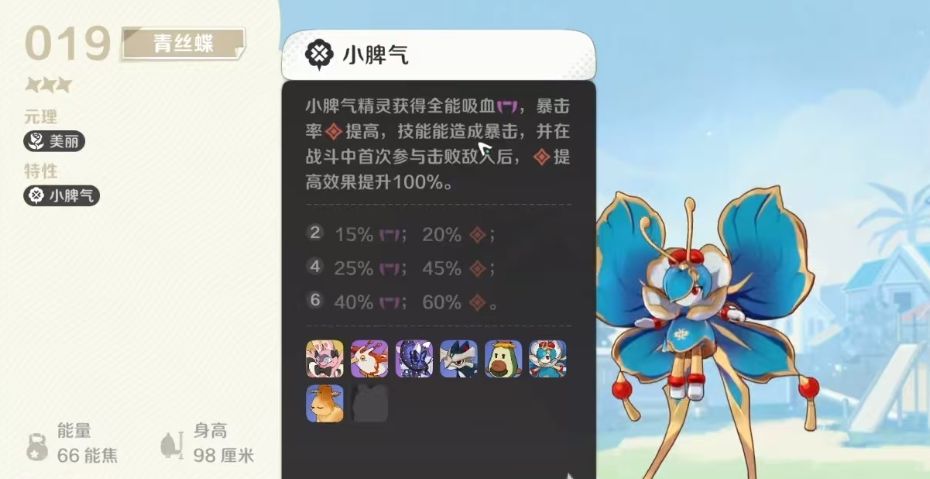 当然这个恢复的是能量上面的数据,基础是20点的能量恢复,如果是激发效果得到提升的话,那么这里提升的主要是触发这个回复的概率,而不是回复的百分比,最高的时候触发的概率基本是达到了50%的,所以一半一半的几率也可以让他整体的生存能力得到足够的提升,另外他在特性上面是属于小脾气类型的特性,凡是带有此类特性的精灵,其实在战场上面都会得到一定的吸血恢复效果,而且在暴击率上面也会有百分比上面的提升,使用技能进行输出的时候也会有更大的概率可以造成暴击,且此类特性带来的击败效果,可以在战斗中让大家首次参与了敌人击败的流程,之后还可以带来百分100%的暴击率提升效果,所以这个提升的羁绊效果其实是比较有全能能力的。
