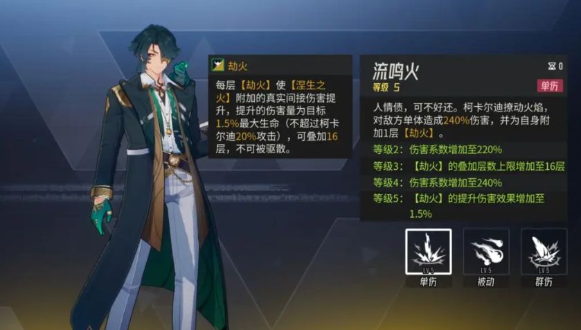柯卡尔在游戏当中的身份是海拉德银行的经理人之首,所以是一个实权人物,剧情里面他拥有的权利也是比较多的,他的普攻叫做流鸣火,使用攻击的时候会带来火焰类型的攻击,这个火焰会针对一个地方的单体目标进行输出,造成的伤害有240%的伤害数值,此时他也可以为自身叠加一层劫火,这个激活的状态是他本身特殊的一个状态,这个状态可以是涅生之火,上面附加足够的真实伤害提升,那么提升的伤害量为目标1.5%的生命数值,这里不超过柯卡尔20%的攻击数值,而且这个效果也是可以叠加到16层的,并且他有一个能力是不可以被驱散,那么他的被动就是这个涅生之火,这个被动相当于是柯卡尔的一个核心机制,因为只要是场上存在一些友方单位的话,柯卡尔就无法被敌方选中为他的攻击中目标。