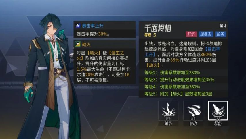 当然这个效果如果是处于被控制情况下的话,那么效果是不会生效的,而且柯卡尔他只要存在足够的结火,并且产生暴击,那么他的这个被动就会让他对目标额外附加一段输出,此时的出也会根据对方最大生命值的真实伤害来进行百分比输出,这里的话造成的伤害达到了300%的效果,而且还可以提升用队友的能力,此时在友方行动进度上面会得到20%的提升,且有暴击率上升的状态,可以叠加到两个回合,最后给自身带来的增益是两层劫火的叠加。