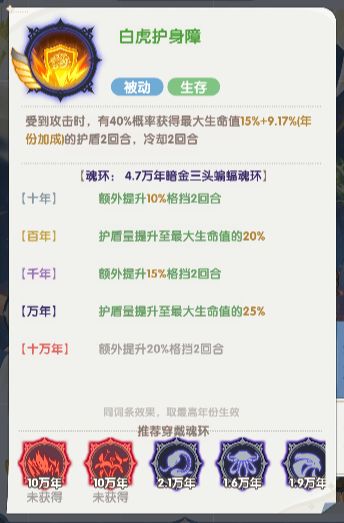 受到攻击时,有40%概率获得最大生命值15% (年份加成)的护盾2回合,冷却2回合