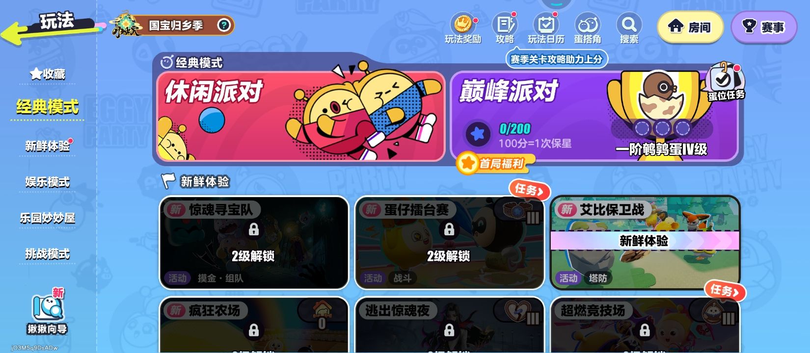 玩家打开蛋仔派对的主界面,可以直接在页面找到巅峰派对,点击巅峰派对之后,可以找到房间的入口,创建房间之后可以看到左侧的分类栏,找到娱乐模式,下面会有多种不同的玩法,玩家可以看到里面就有逃出惊魂夜。在逃出惊魂夜的房间列表中会标注着进入按钮的房间,这些全部都是可以加入的战局只需要点击进入就可以快速的开启游戏。如果想要掌握主动权,就可以点击创建房间,然后邀请好友加入。
